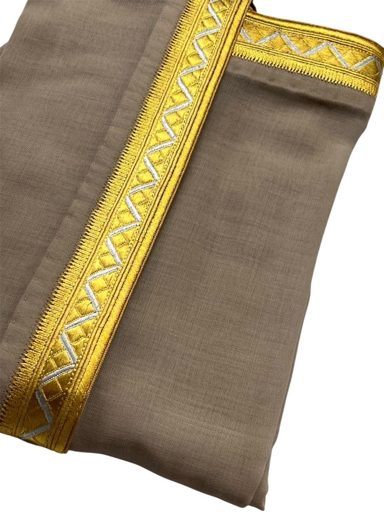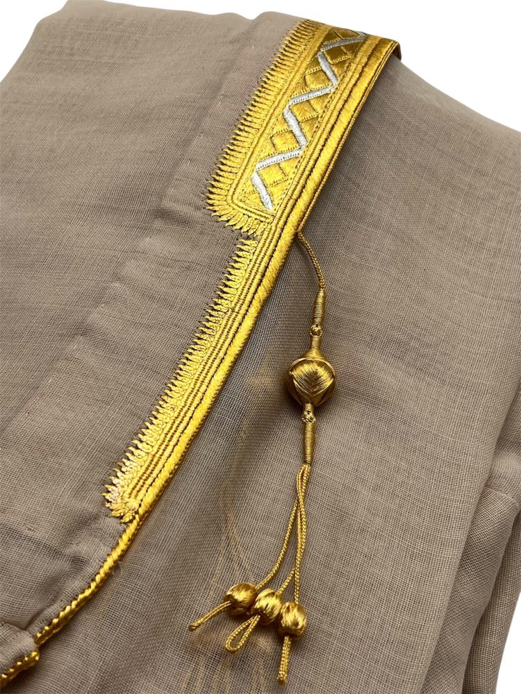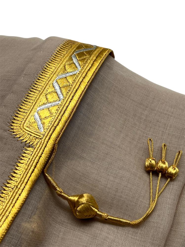 - يأتي بشت ملكي غاط بيج بتطريزات ذهبية اللون وكذلك نقوشات باللون الفضي ليمنحك الإطلالة الملكية.
